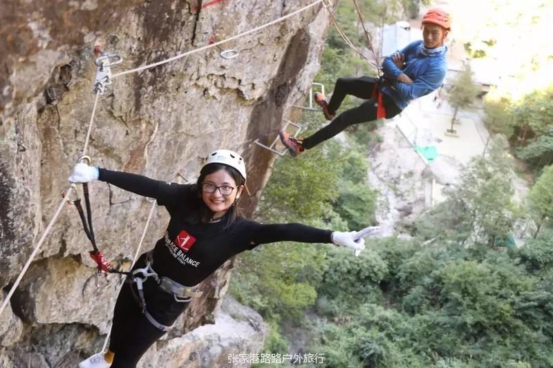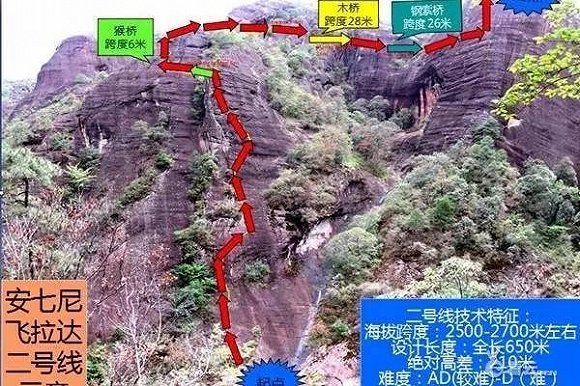 而难度较大的二号线全程600多米,落差达210米。完成二号线,相当于你徒手攀爬到了70层楼的高度!平时不锻炼的估计就很悬了。