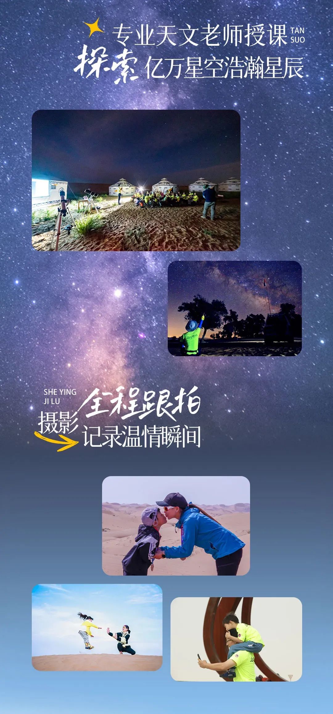 晚上体验轻奢露营,亲子合力搭建庇护所,共同体验沙漠火锅。晚餐结束后在星空下观星,专业导师带领进行天文课堂教学,使用天文望远镜观测星空,拍摄星空照片,一天的活动圆满结束,营地的淋浴间中,洗个热水澡,舒舒服服的进入梦乡。