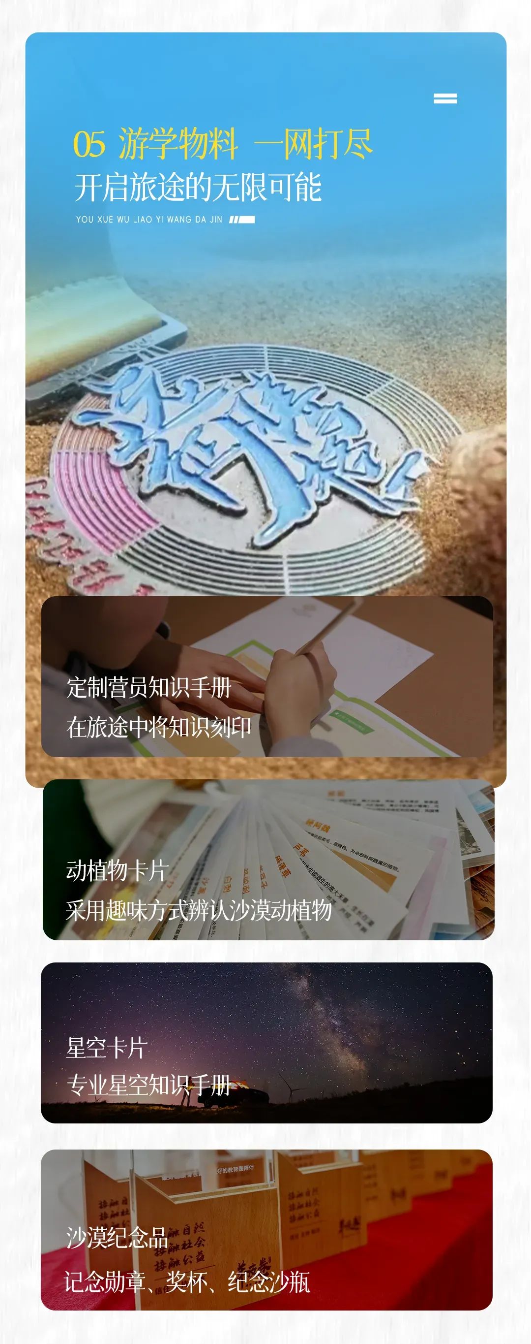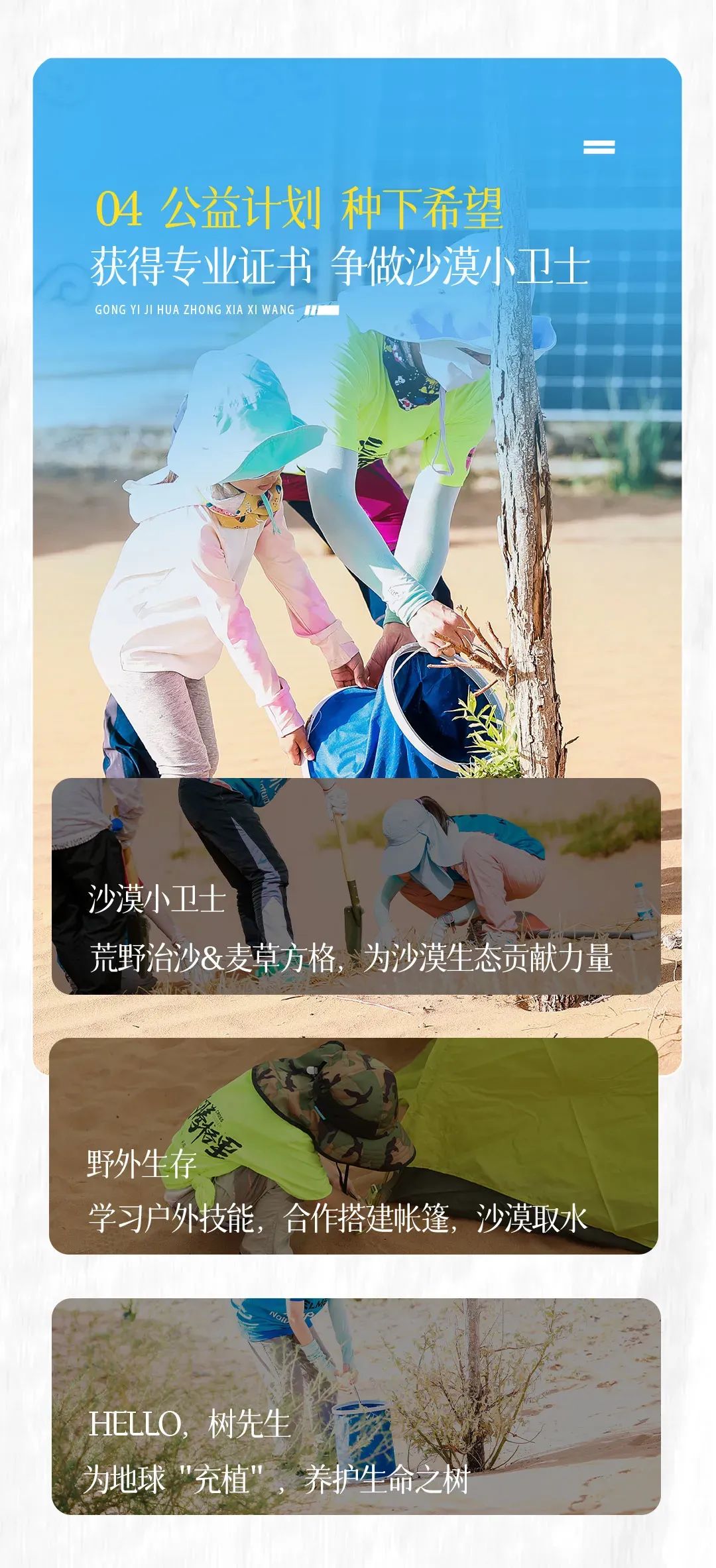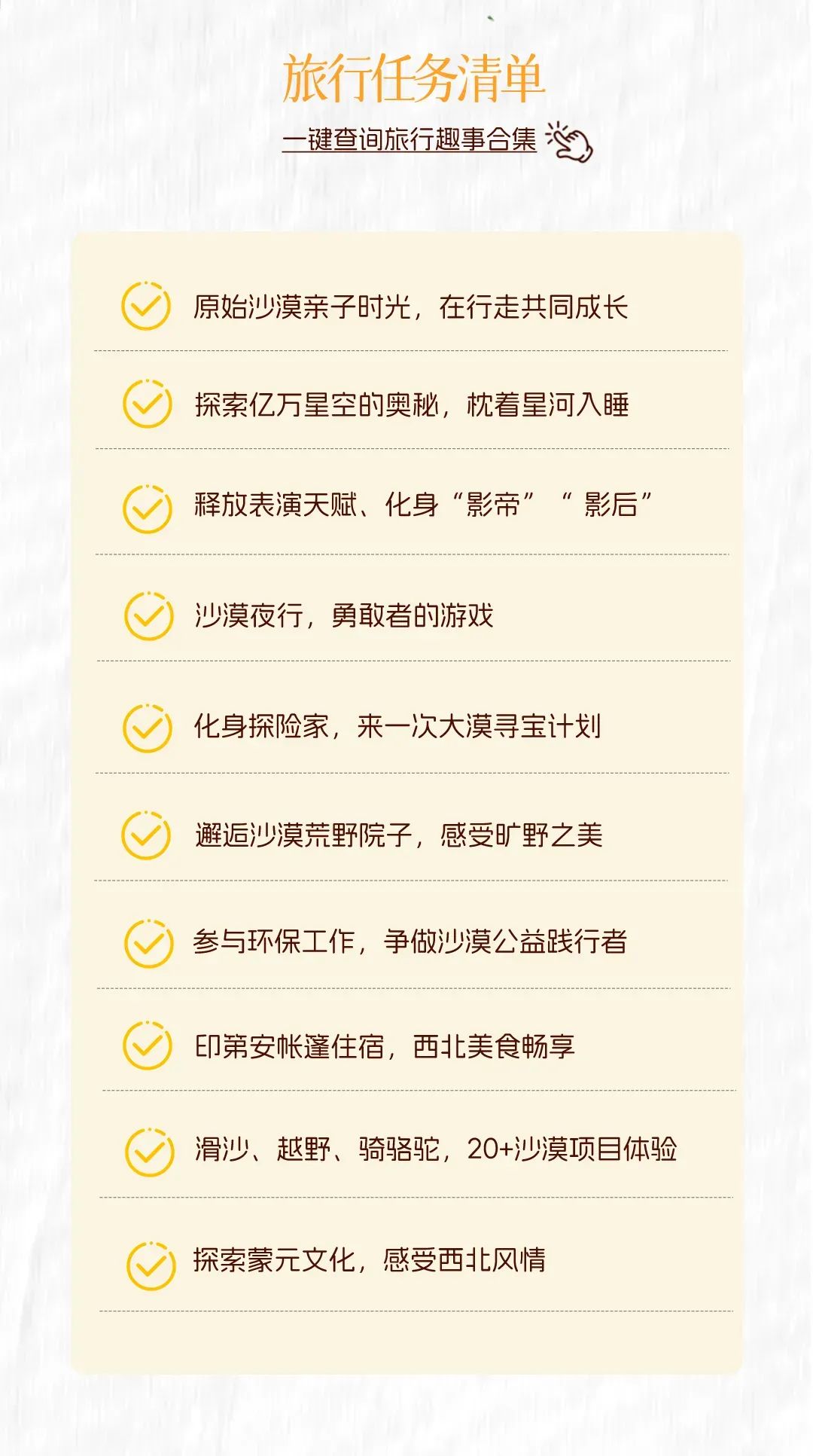 6、项目:动植物科普、沙漠取水、麦草方格、沙漠滑沙、天文星空课程、沙漠互动游戏、沙漠打卡拍照、时光驿站写明信片、围炉煮茶等活动费用。