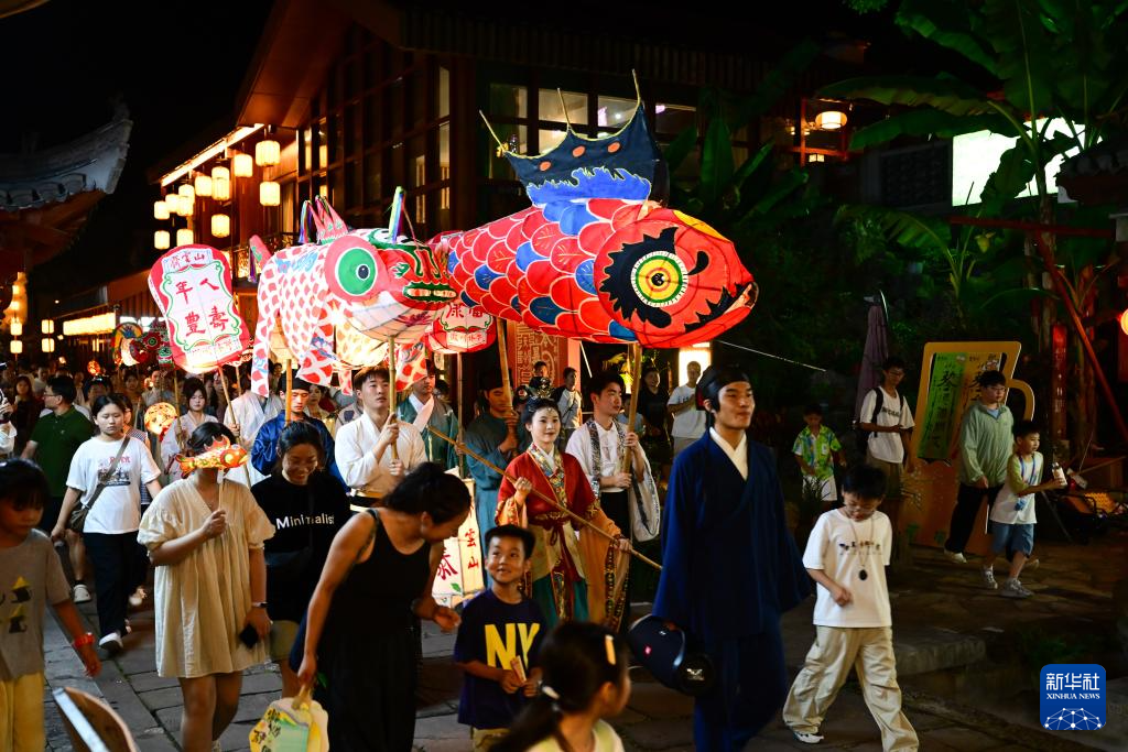 跟着看似杂乱无章的巡游队伍不断游走,耳边充满了嬉笑鼓乐之声。就算只是站在高处跟着鱼灯舞动,在火树银花间留下“人生照片”,也能收获几乎溢出屏幕的喜庆氛围。